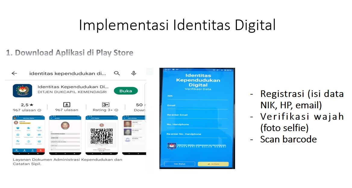- Penduduk melakukan registrasi dengan memasukan NIK, email, nmor HP dan melakukan swafoto di depan petugas untuk verifikasi wajah dan pindai QRCode